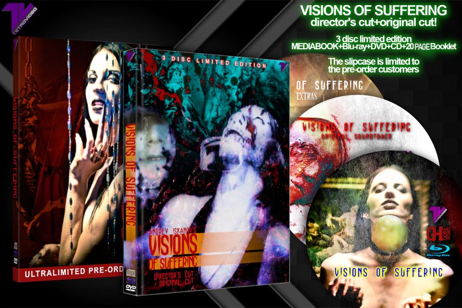 Produced, written and directed by Andrey Iskanov (Nails, Philosophy of a Knife, Ingression), the surreal and visionary horror film Visions of Suffering (2006) comes in a 3-disc Mediabook limited edition (only 300 copies) both with the Director’s Cut and also the Original Cut: Blu-ray + DVD + Soundtrack CD + 20-page Booklet + Slipcover (limited to the pre-order customers) with english, italian and french subtitles.